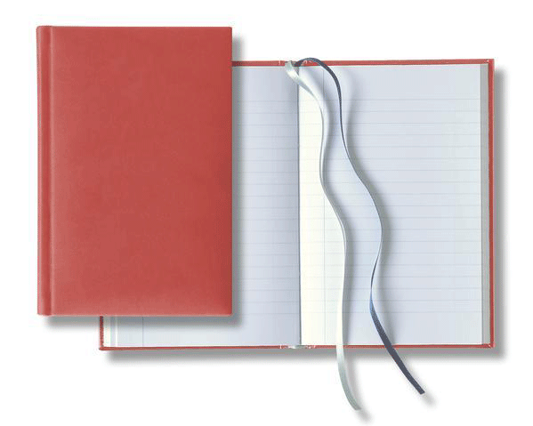 A 256-page journal with lined pages printed in gray. Two ribbon markers. 4 1/2" x 6 11/16". Available in Burgundy, periwinkle, terracotta, red, black, light green, green, burnt orange and navy blue.